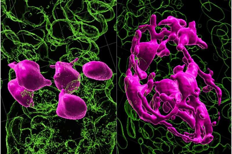Hair-coloring stem cells (at left, in pink) need to be in the hair germ compartment in order to be activated (at right) to develop into pigment.