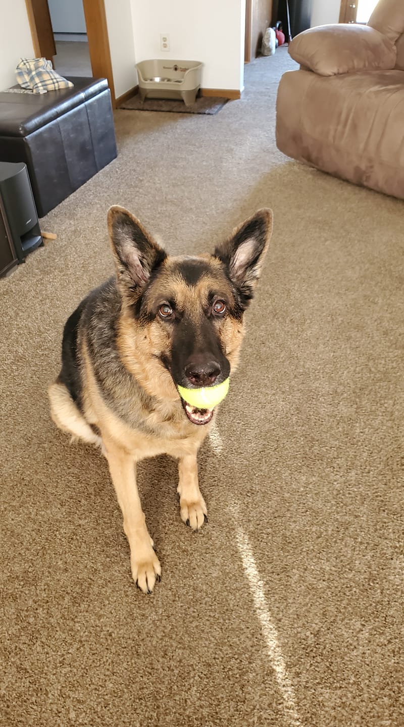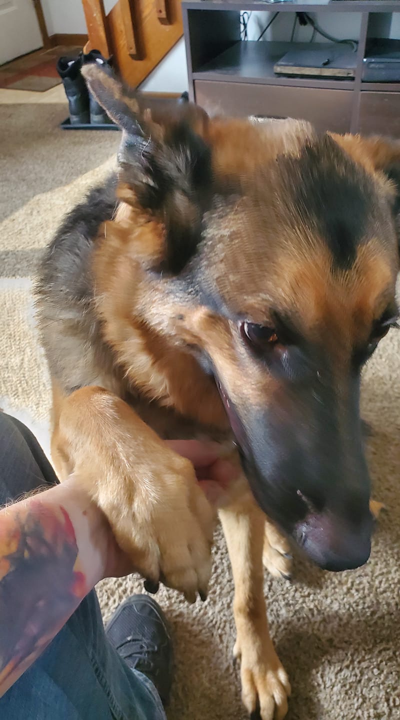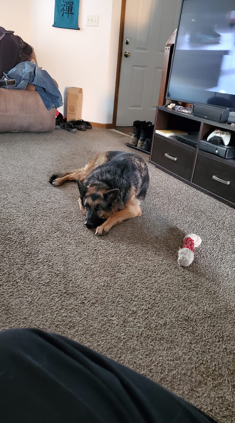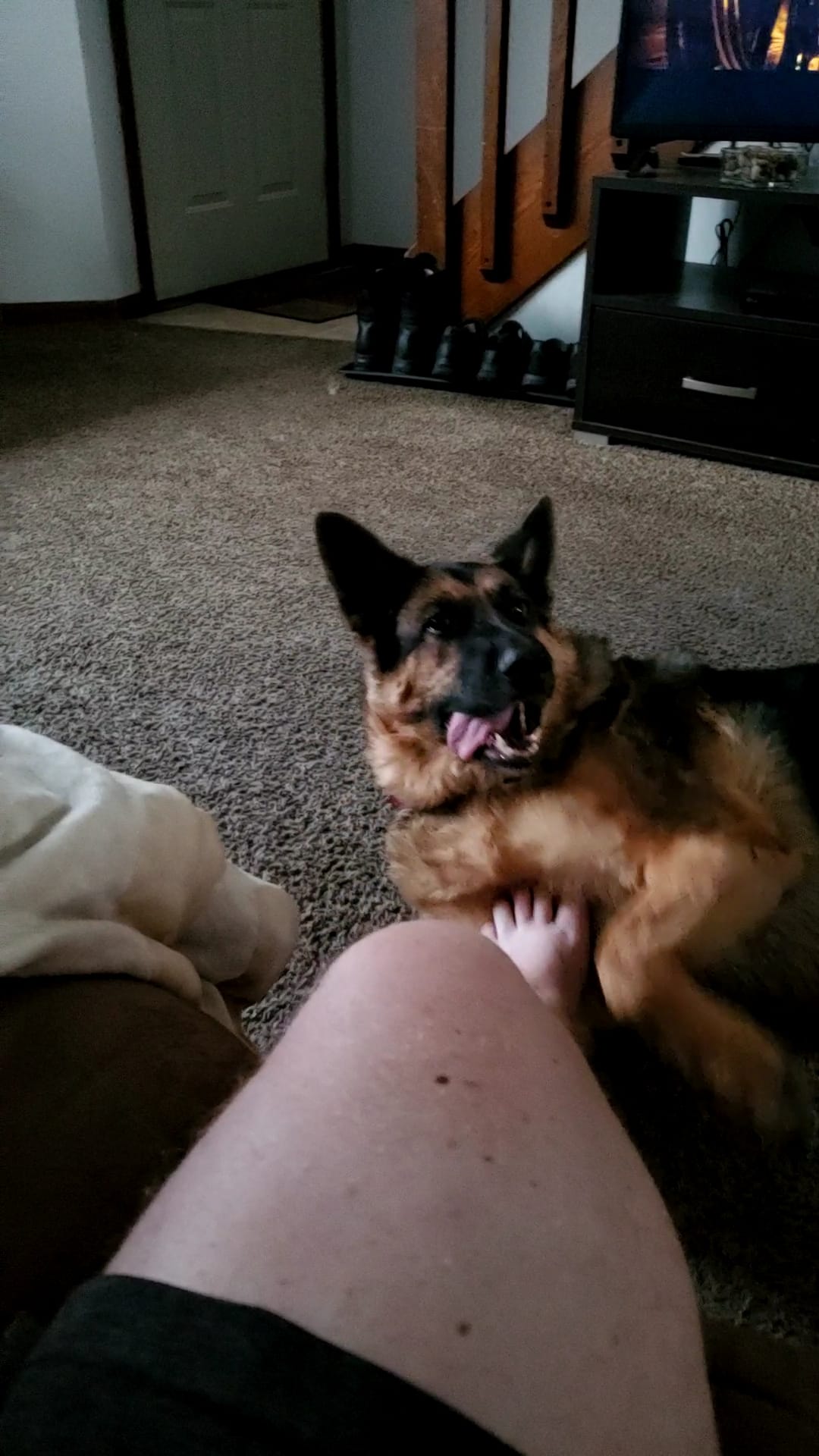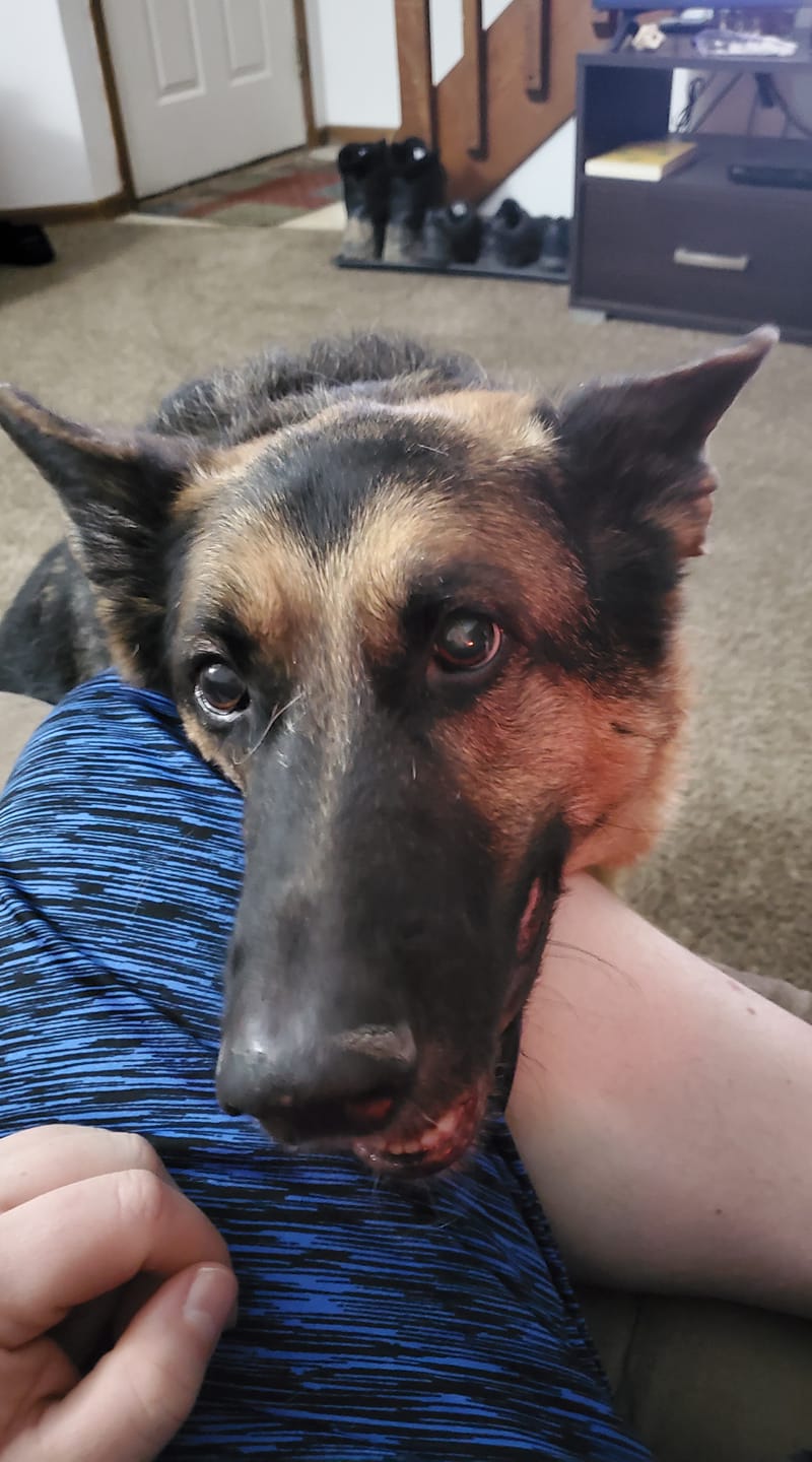 There is a ritual when I get home form work. She goes outside, then when she comes back in. I have to go to the couch and sit at the edge and tell her to bring it in. She gets as close as she can and puts her head on my chest.