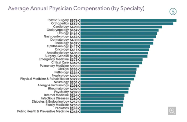 The highest-earning specialties are virtually unchanged this year from 5 years ago, in 2017. For employed physicians, these figures include salary, bonus, and profit-sharing contributions. For self-employed physicians, they include earnings after taxes and deductible business expenses before income tax. Only full-time salaries were included in our results.