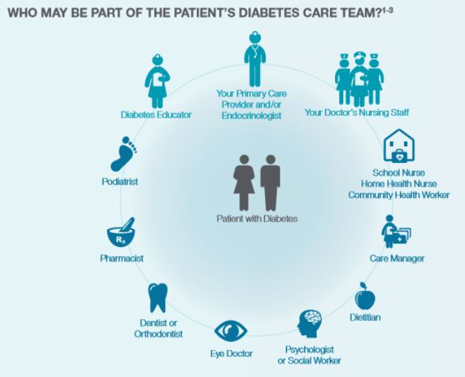 It takes a team to manage and care for people with diabetes. Similar to sports teams, there are multiple players with various roles. Each health care team member brings their own unique set of skills, which when used appropriately, can complement the aptitudes of other team members. The patient is the key member of the team. The ultimate goal is to optimize the patient’s management, care and outcomes. Literature and guidelines support the use of a coordinated multi-discipline team.