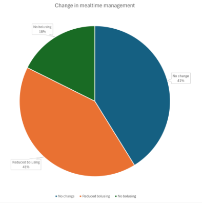 Amongst those who responded, the biggest impact was a reduction in total daily insulin dose, with 91% of those reporting TDD data seeing a mean reduction of 45%. 59% of respondents reported a reduction in carb announcing/bolusing around mealtimes. Additional benefits included an increase in both TIR and TITR and reduction in hunger. Adverse side effects included elevated ketone levels, gastrointestinal issues, mental health problems and difficulty in recovering from hypoglycemia.