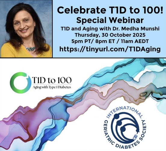 What’s Exciting in T1D/Aging Research with Dr. Medha Munshi hosted by T1Dto100.com, scheduled on Thursday, 30 October 2025 (times and link below).