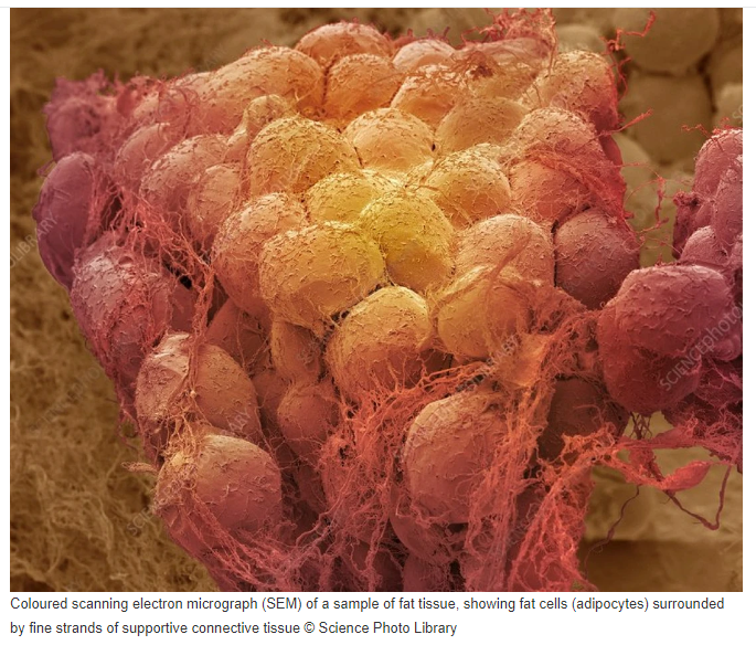 When we talk about body fat, we’re actually talking about the specialized cells, known as ‘adipocytes’, which store fat in various places in our bodies. Each cell holds its own droplet of liquid fat and is capable of swelling to accommodate more fat, or shrinking and releasing it as necessary. Together, these fat cells form ‘adipose tissue” which is found in deposits just below the skin or deep in the spaces between other organs.