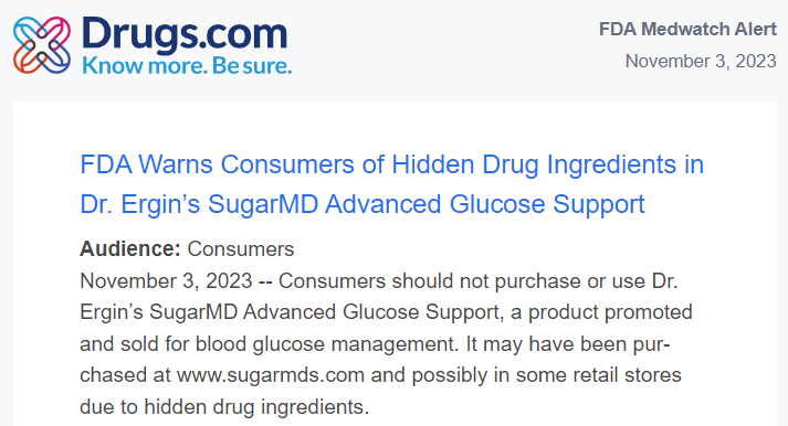 Dr. Ergin’s SugarMD Advanced Glucose Support is a product that can be purchased online at www.sugarmds.com and possibly in some retail stores. The FDA said it conducted a laboratory analysis of the product and confirmed it contains glyburide and metformin, two active ingredients that can be found in several FDA-approved prescription drugs for the treatment of diabetes. The FDA said people who use the product could take a larger combined dose of the diabetes drugs than they intend, which could lead to adverse events. The risk for adverse events is highest for people with chronic kidney disease.