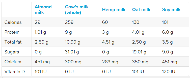 The following table compares the nutritional values of 240 milliliters (ml) -about 1 cup -of almond, cow, hemp, oat, & soy milk in grams (g), milligrams (mg), or international units (IU):