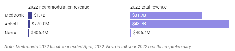 Abbott device approval sets up battle with Medtronic, Nevro for diabetic peripheral neuropathy treatment by Elise Reuter for MedTechDive.com, 6 February 2023. Three firms are bringing their devices to a $3 to $5 billion market, aiming to relieve a painful side effect of diabetes.
