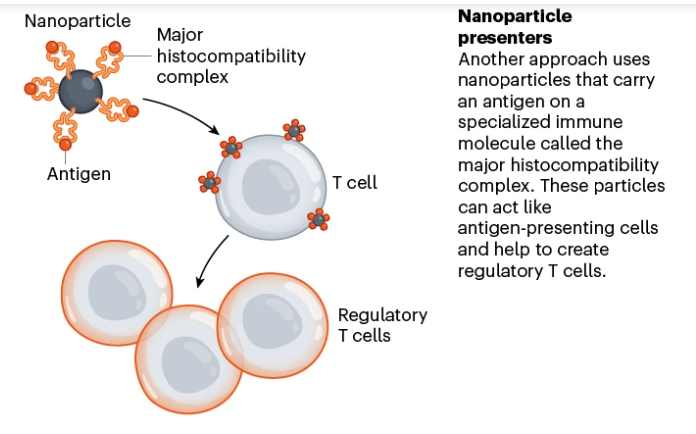 His team’s nanoparticles — which he calls navacims — are decorated with proteins called major histocompatibility complex molecules that jut out from the surface of the particle-like spikes. These spikes are meant to mimic those found on immune regulatory cells known as antigen-presenting cells, which mop up antigens all over the body and then take them to T cells, telling the cells whether to attack or ignore them. Santamaria likens them to T-cell bait.