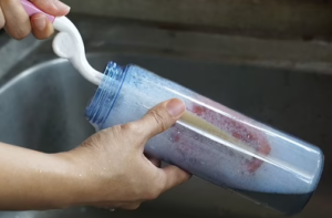 For more heavy contamination (from long usage without washing), add a half vinegar/half water mixture and soak for several days. Then clean using the methods outlined above. To avoid getting ill from your water bottle, you should ideally clean it with detergent after each use, or at least several times a week. It is also important to clean any lids or attachments such as straws as these can also harbour microbes.