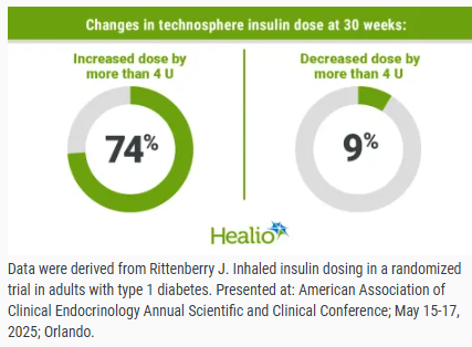 Most adults with type 1 diabetes using inhaled insulin increase daily dose over 30 weeks by Michael Monostra for Healio.com/endocrinology, 16 May 2025.