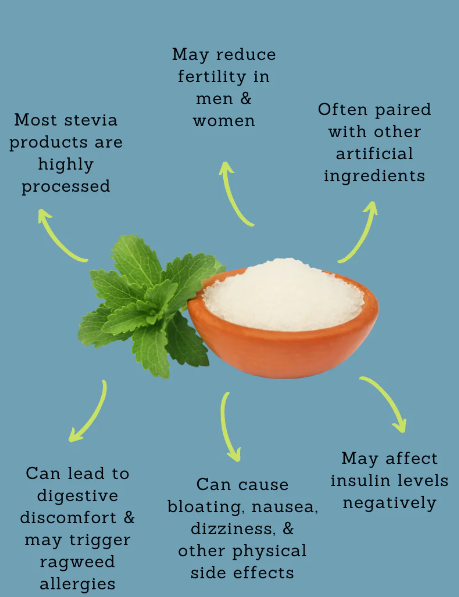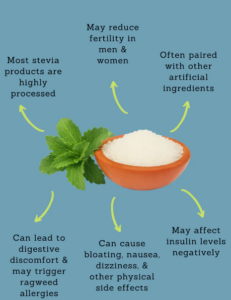 With the highly processed stevia, there are still precautions. According to Rifkin, stevia can cause some people to have GI symptoms, such as diarrhea, upset stomach and bloating.There’s also such a thing as consuming too much stevia. The acceptable amount defined by the World Health Organization is 4 mg per kilogram of body weight. For a 150-pound person, that’s eating 10 packets of stevia daily.