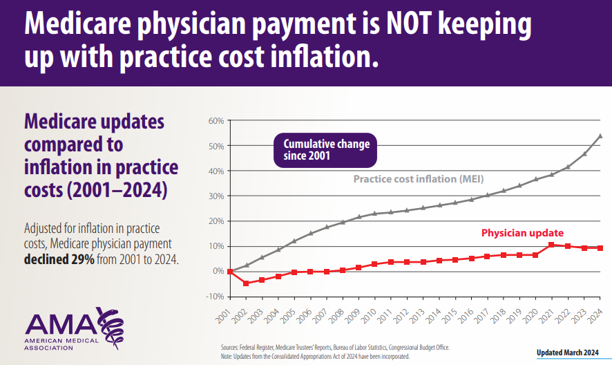 Latest proposed cut—2.8%—shows need for Medicare pay reform by Kevin B. O’Reilly for AMA-Assn.org, 10 July 2024.