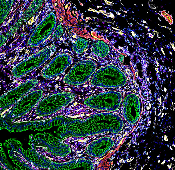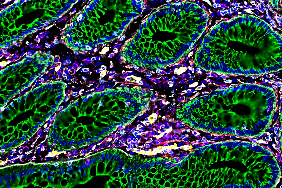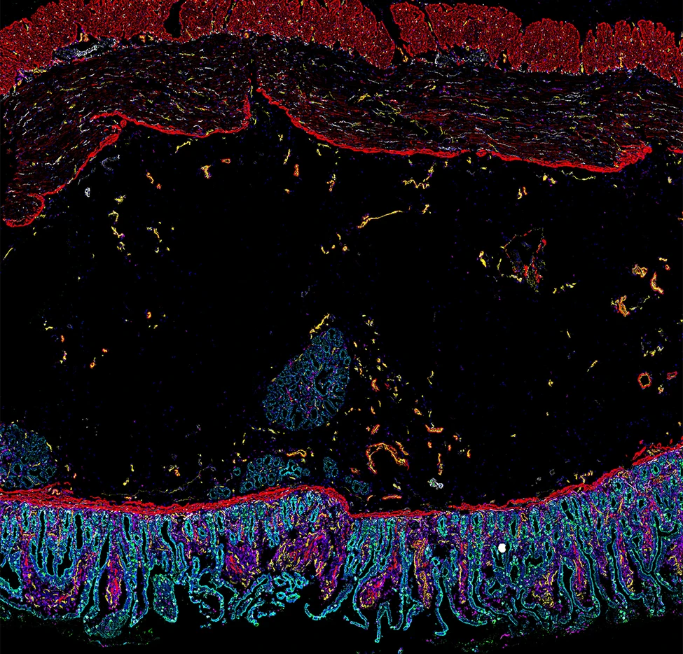Specific cells within the gut were tagged with different colors to highlight different cell types. The green areas in this image are cytokeratins, a type of protein that enable cells to withstand mechanical stress during the digestion process. They are surrounded by immune cells (shown in magenta) and eukaryotic cell nuclei (shown in blue). The red areas show muscle tissue.