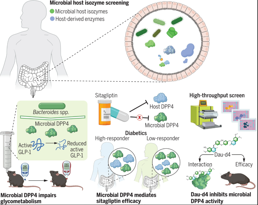 In searching for these interactions, the research team identified 71 enzymes with activity in human gut bacteria communities. They found species of Bacteroides producing microbial dipeptidyl peptidase 4 (mDPP4). The human version of DPP4 plays a significant role in regulatory processes such as T-cell homeostasis and metabolism. In the metabolism, DPP4 has a direct role in degrading the hormone GLP-1.