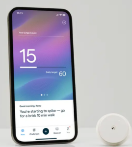 Abbott’s Lingo is intended to show people how diet and exercise affect blood glucose levels. The sensor hardware is similar to Abbott’s prescription CGMs, but the app presents different information. The app includes a graph of glucose readings, a count of glucose spikes, and food and activity logging. It also offers tailored recommendations based on food, time of day and glucose spikes.